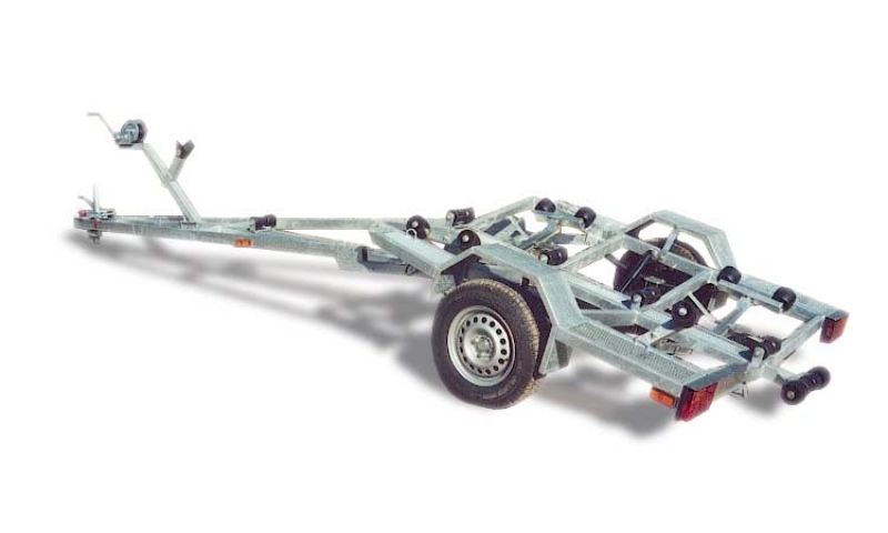 Прицеп оцинкованный. Оборудован тормозной системой. Задняя часть рамы опрокидывается. Оснащен 4-мя домкратами с качающимися спаренными колесами для установки катера. Рессоры+амортизаторы.