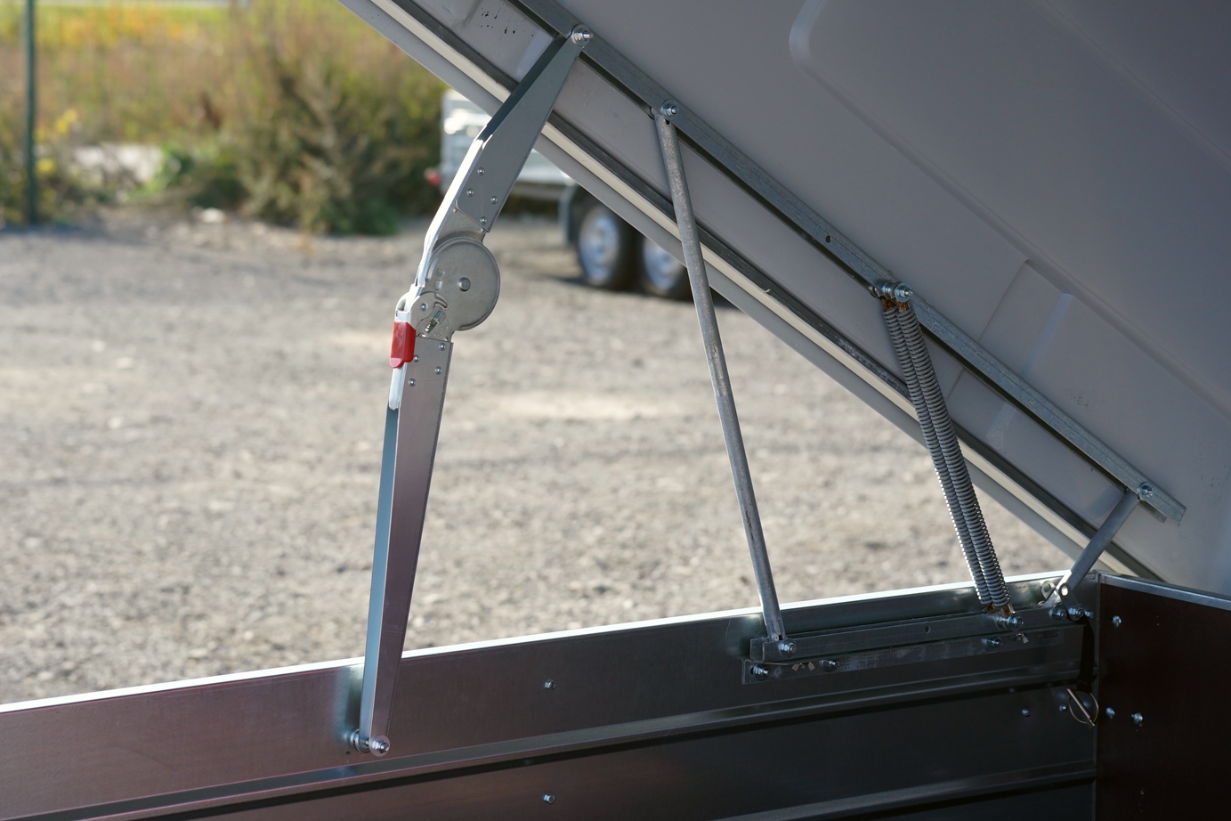 Шведский фиксатор крышки в открытом положении это дополнительная опция, он необходим для удержания крышки при отпускании кузова вместе с техникой и для дополнительной безопасности людей которые в кузове. Сохраняет механизмы подъёма крышки разгружая их.
